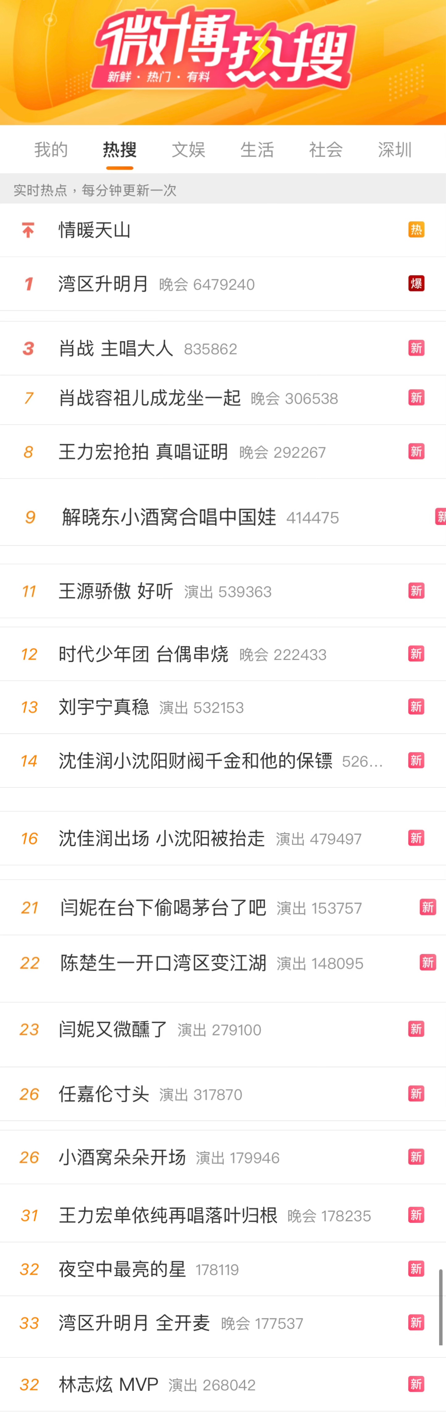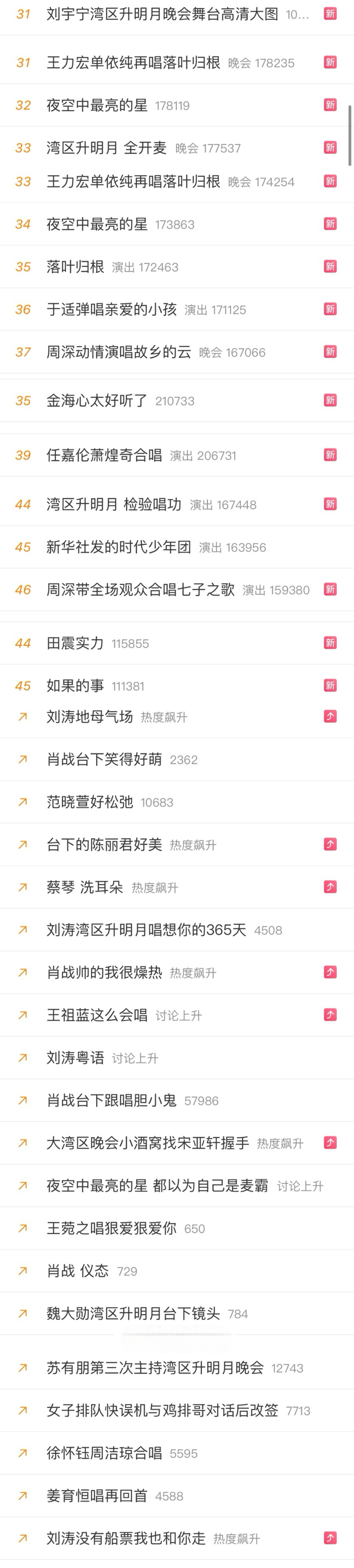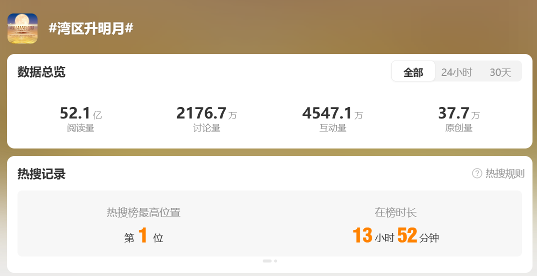 晚会的影响力远超舞台,在全网引发现象级讨论。主话题#湾区升明月#持续霸占热搜榜首,整晚“爆”屏不断,截至目前,晚会落幕不到24小时,相关话题阅读量突破百亿,全网累计热搜超50个,真正实现破圈传播。