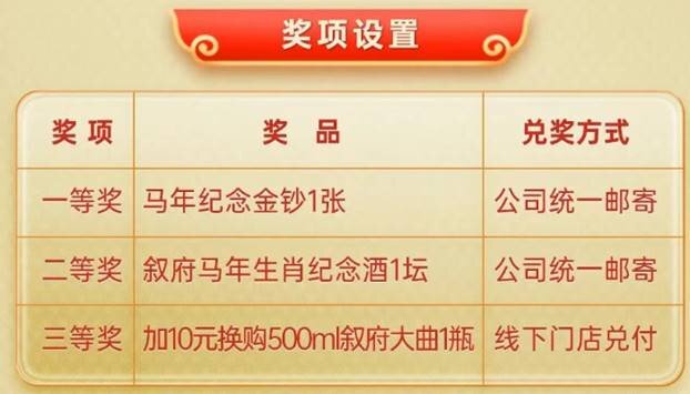 购买叙府大曲升级版(二维码版)的消费者,只需扫码即可参与抽奖。在享受原有扫码活动福利的同时,还有机会赢得元春限定惊喜奖品。这份情深意重的礼物,寓意着新年一马当先,好运连连。